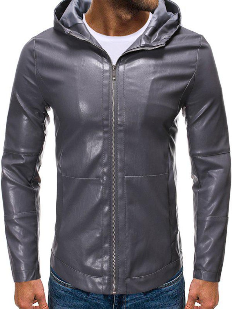 Hooded Zip Up Faux Leather Jacket