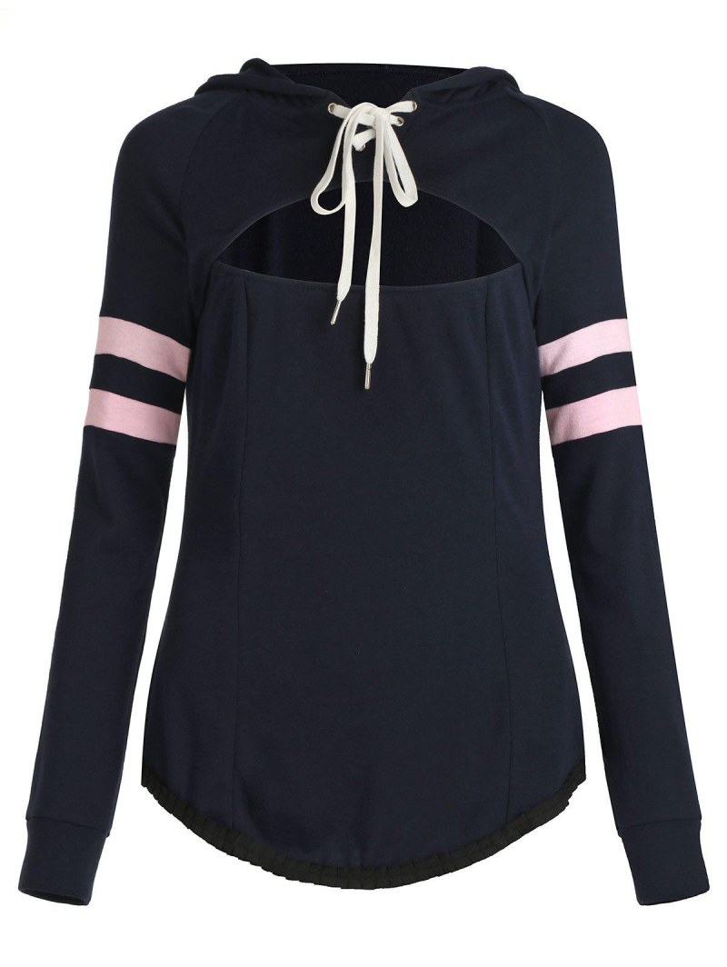 Lace Up Stripe Contrast Hollow Out Hoodie