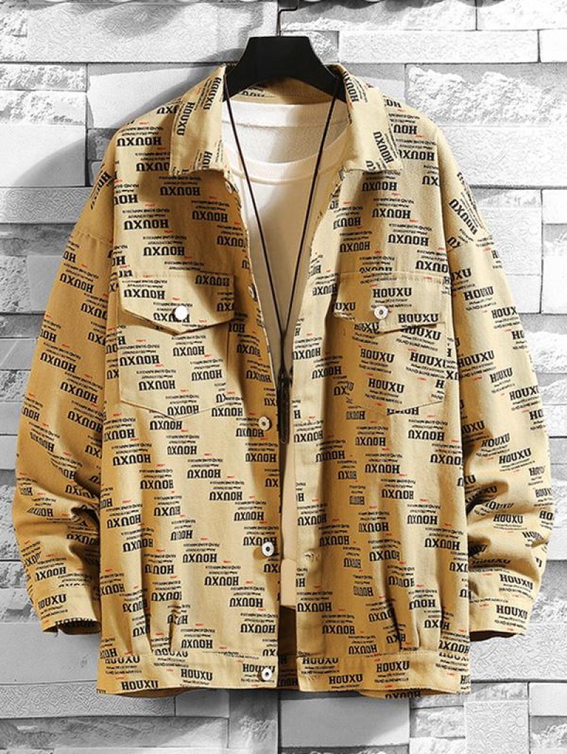 Button Up Letter Graphic Print Flap Pockets Shacket